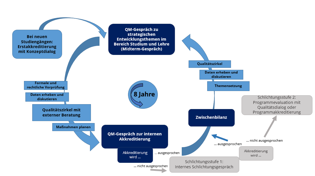 Für den Fall von Konfliktsituationen sind im Rahmen des internen Akkreditierungsverfahrens Schlichtungsstufen vorgesehen. Als erste Stufe findet ein hochschulinternes Schlichtungsgespräch statt. Führt das Schlichtungsgespräch nicht zu einer Einigung, folgt entweder eine Programmevaluation oder eine Programmakkreditierung durch eine externe Agentur.
