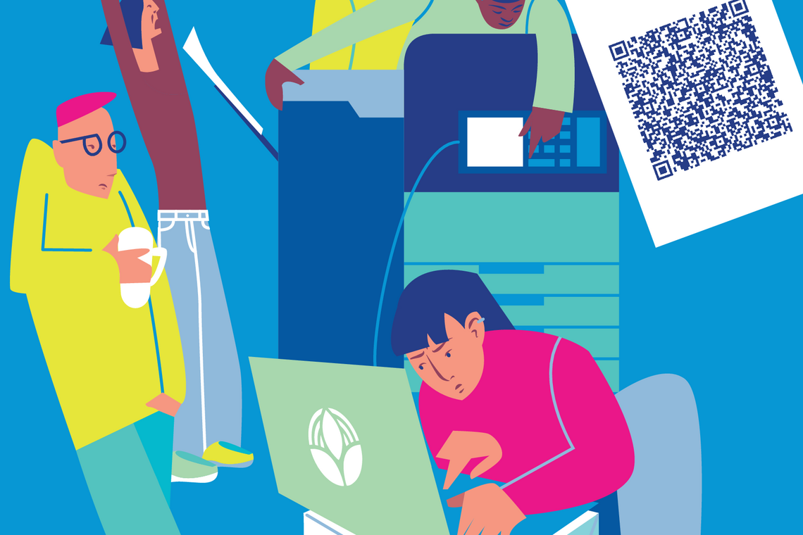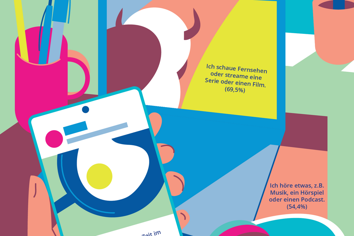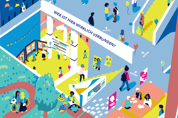Auf die Frage „Wer ist hier wirklich verbunden?“ gibt es keine eindeutige Antwort. Auf dem Wimmelbild begegnen euch Menschen, die gemeinsam lernen, Sport treiben, gärtnern, in einer Vorlesung sitzen oder miteinander sprechen. Andere sind allein unterwegs – wie die Person, die unter dem Baum sitzt.