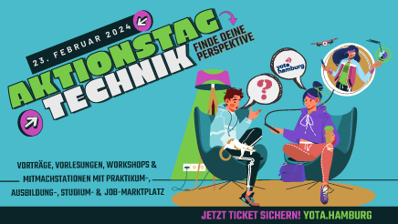 Gemeinsam mit dem YOTA - Young Talents Hamburg und vielen Partnern (Airbus, DLR_Schoollab an der TU Hamburg, European XFEL GmbH, Fab City Hamburg, Deutsches Hafenmuseum (Standort Schuppen 50a), Erneuerbare Energien Hamburg Clusteragentur GmbH, Hamburg Aviation, HAW Hamburg, HCAT +, Dr. Heinrich Netheler Stiftung, Jugendberufsagentur Hamburg, LearnForTomorrow, Logistikinitiative, Maritimes Cluster, Museum der Arbeit, NXP Semiconductors Germany GmbH, Patient Zero Games GmbH, Pro Technicale, Science Lab, StickTo, Teccon und Young Makers Hamburg) freuen wir uns darauf, euch spannende Einblicke in die Welt der Technik zu geben und euch bei eurer Berufs- und Studienorientierung zu unterstützen.